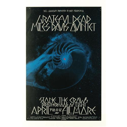 <B>Grateful Dead "Seashell" Fillmore West Concert Poster #BG227 (Bill Graham, 1970)</B></I> A hard-to- find first printing (of only two) for this poster from the Fillmore West. The Grateful Dead were joined on the stage that night by the legendary Miles Davis Quintet and Stone the Crows. This poster grades VG+ due to a few tack holes in each corner, and it measures 14" x 21". As part of the Bill Graham numbered series this poster bears the designation BG-227.