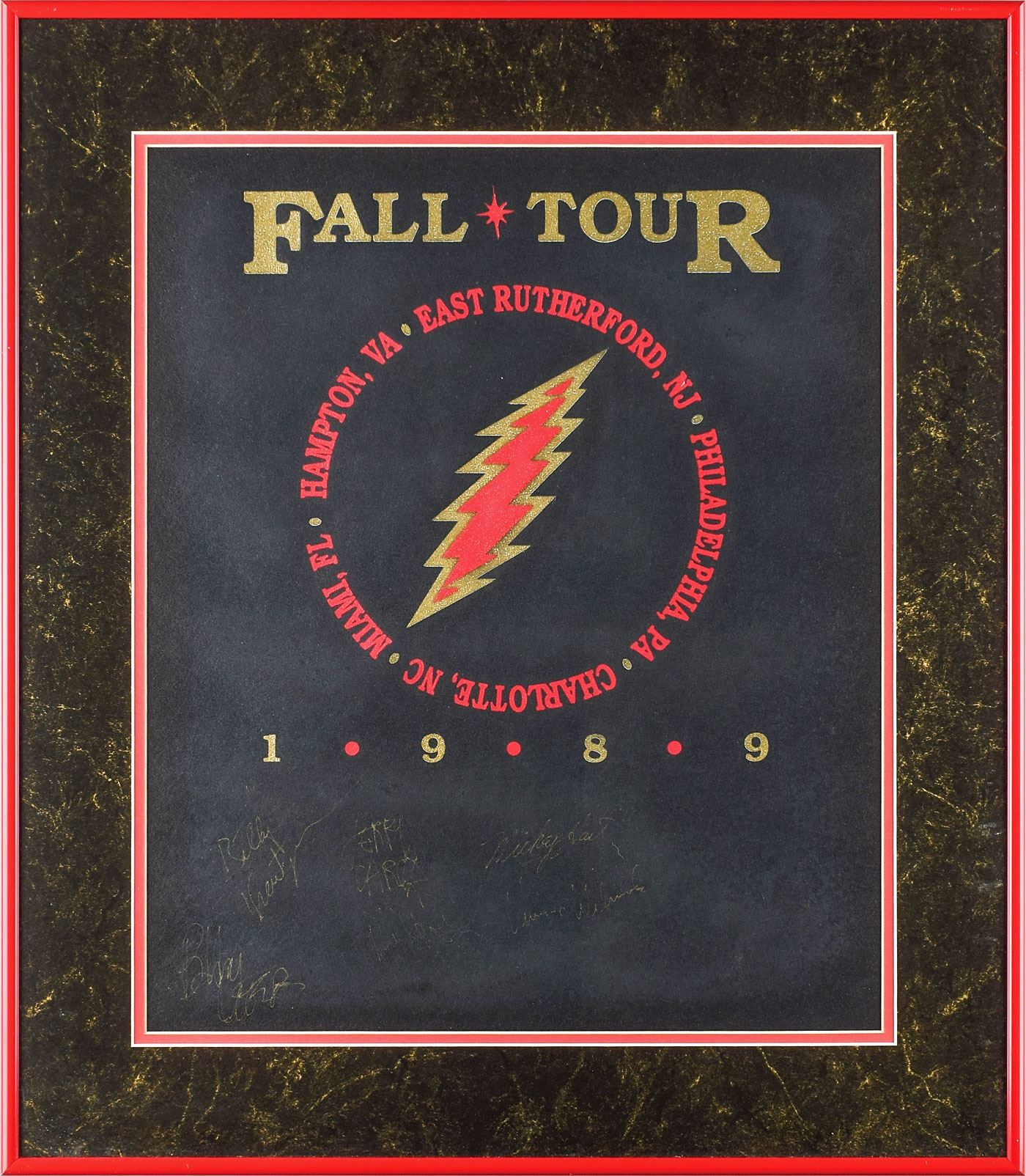 Fantastic color t-shirt artwork pelon showing a gold-and-red lightning bolt encircled with the names of five cities included on the Grateful Dead’s east coast “Fall Tour, 1989,” 14.5 x 17.5, signed in gold ink by Jerry Garcia, Mickey Hart, Phil Lesh, Bill Kreutzmann, Bob Weir, and Vince Welnick. Nicely double-matted and framed to an overall size of 20.25 x 23.25. In fine condition, with the signatures quite faint but mostly legible. Accompanied by a full letter of authenticity from REAL. These pelons were printed in very low quantities making this a very scarce piece.
