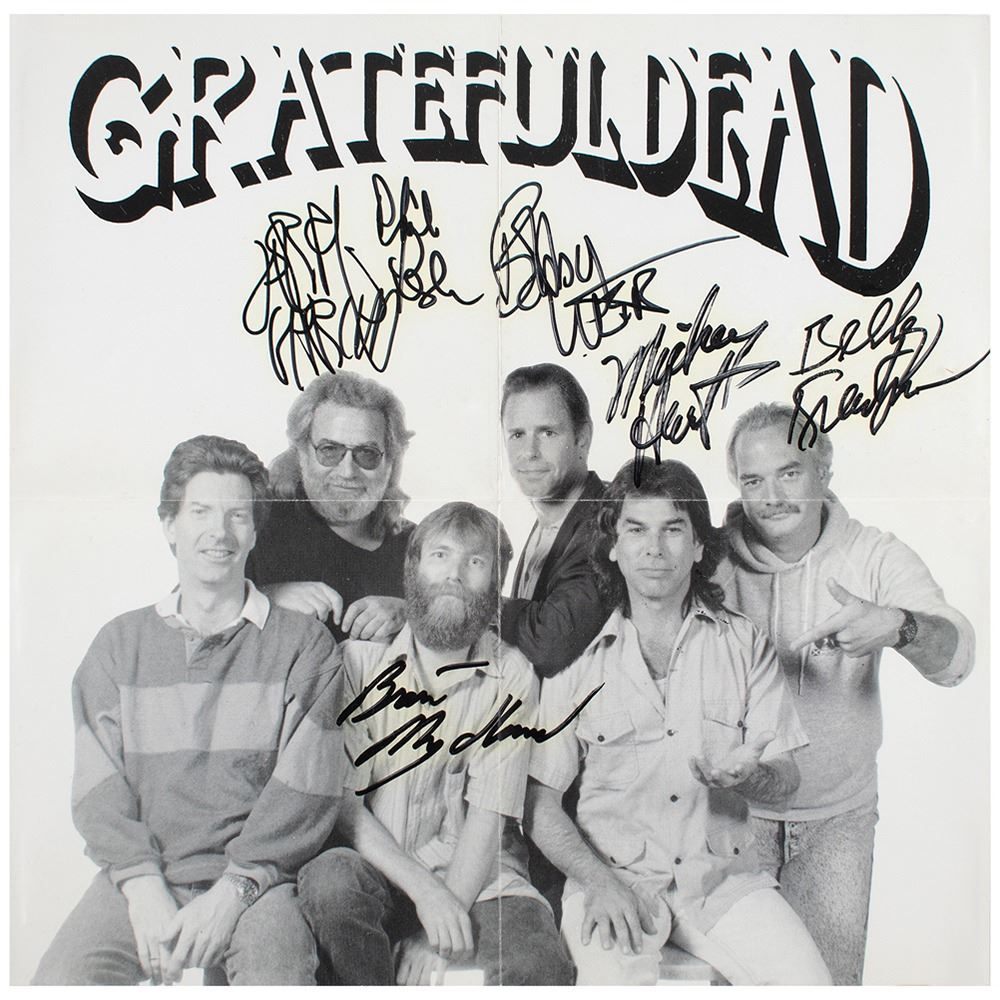 Built to Last CD from the Grateful Dead, signed nicely on the inside of the foldable booklet in black felt tip by Jerry Garcia, Bob Weir, Bill Kreutzmann, Phil Lesh, Mickey Hart, and Brent Mydland. In fine condition, with light yellow haloing to all of the signatures. The CD is included. Accompanied by an unused cloth backstage pass for their show at the Hartford Civic Center on March 18, 1990, where the consignor indicates that the autographs were obtained.