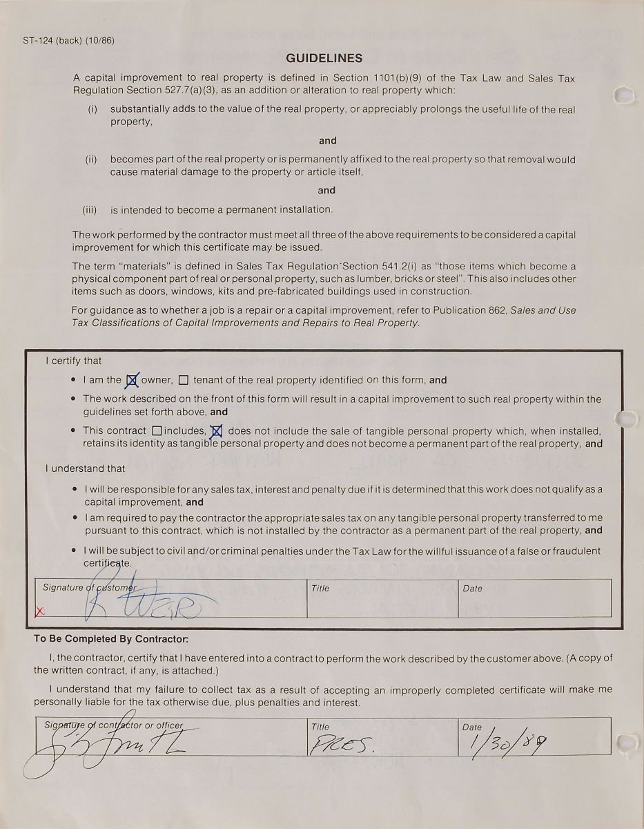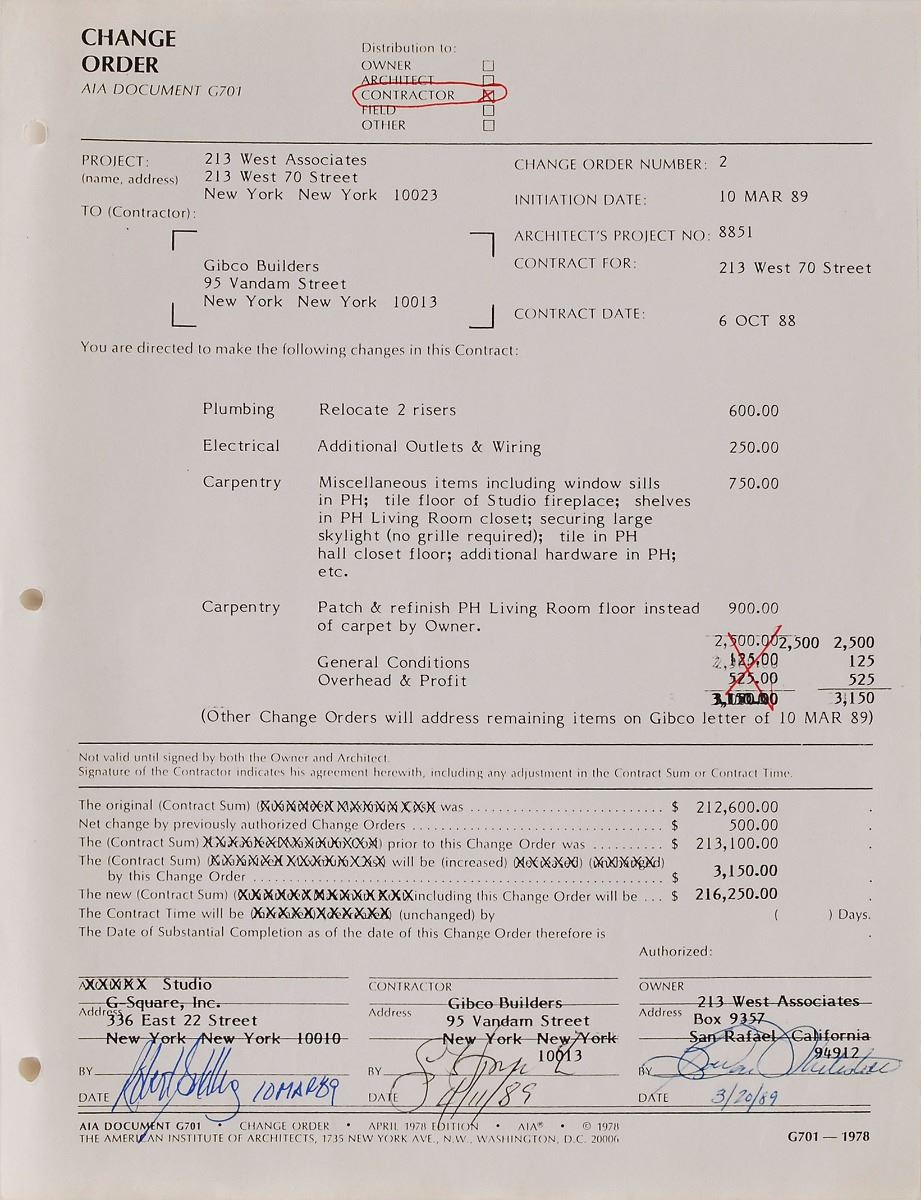 DS, signed “Jerry Garcia” and “R. Weir,” eleven pages, 8.5 x 11, October 6, 1988. An agreement outlining details for a penthouse renovation at 213 West 70th Street in New York by which Garcia and Weir hire Gibco Builders, including “demolition…Intercom, Carpet, renovation of Public Corridors except as noted.” Document is housed in a binder with numerous other papers and documents related to the project, including a New York certificate of capital improvement, January 30, 1989, signed again by Bob Weir, “R. Weir.” Two additional documents are signed by Rock Scully, a longtime manager of the band. Expected document wear and tears to binding holes to the first page, otherwise fine condition.
