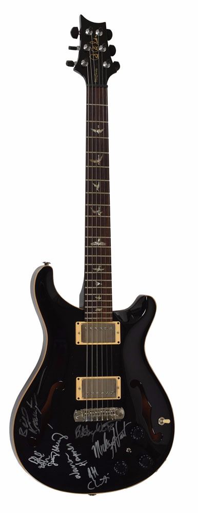 Stunning black-bodied Paul Reed Smith McCarty model hollow-body electric guitar, signed on the body in silver ink by Bob Weir, Phil Lesh, Mickey Hart, Bill Kreutzmann, Warren Haynes, Jeff Chimenti, and Jimmy Herring. In fine condition. Includes a hardshell carrying case. A gorgeous guitar with a loaded cast of Dead autographs.