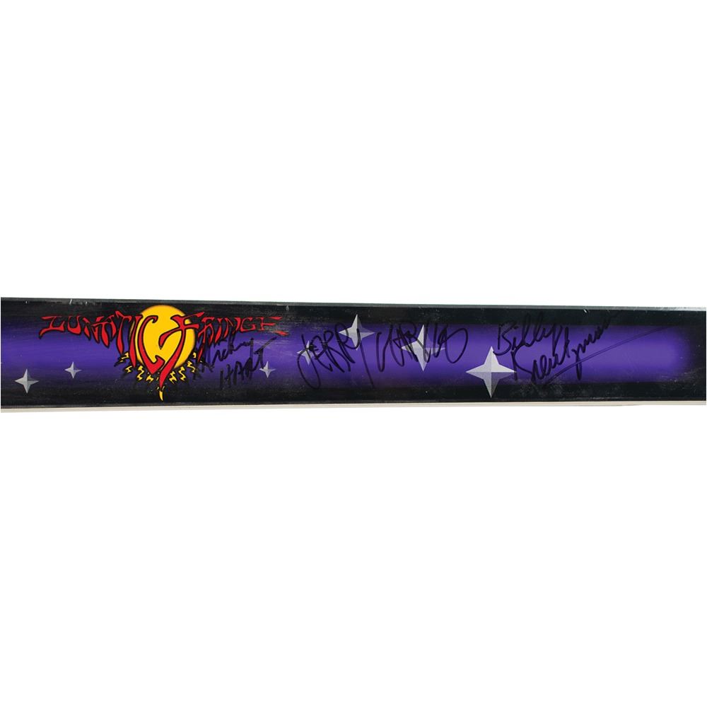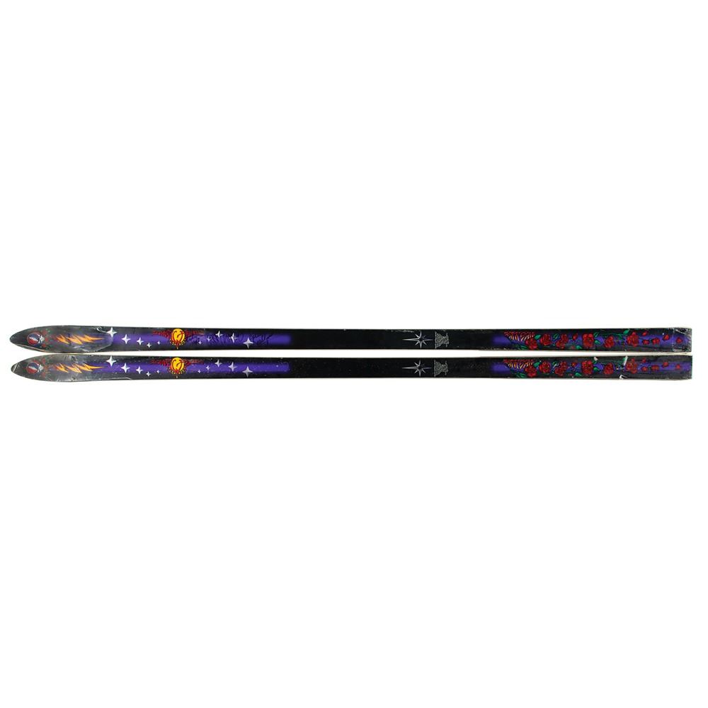 Limited edition Grateful Dead ‘Lunatic Fringe’ skis made in 1992 by K2 in conjunction with Olin, numbered 324/1000, signed on the top of one in black felt tip by Jerry Garcia, Billy Kreutzmann, and Mickey Hart. Designed by Not Fade Away Graphics, these skis were based on a high-end racing model radical slalom side cut ski and bear no holes or gauges. In overall fine condition.