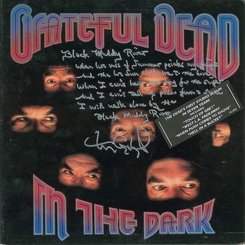 Promotional copy of their In the Dark album signed on the front cover in silver ink by Constanten, adding the lyrics to the beginning of ‘Black Muddy River.’ In fine condition, with some light cover wear and promotional label affixed to front cover. The record is included.