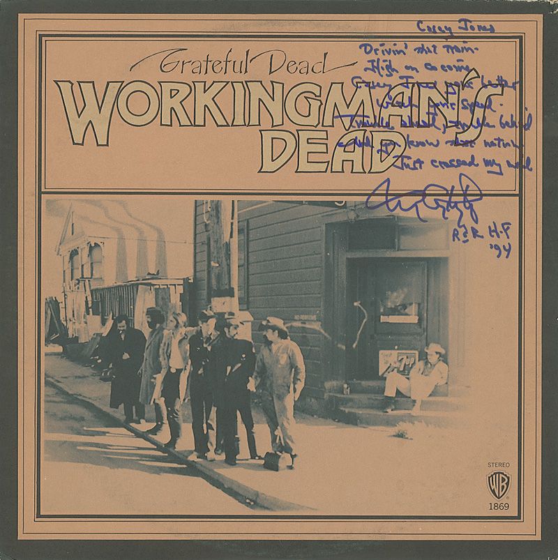 Workingman’s Dead album signed on the front cover by Constanten, who adds the lyrics to the opening verse of Casey Jones. In fine condition, with a light ‘ring of wear’ to cover and some scattered edge wear. The record is included.