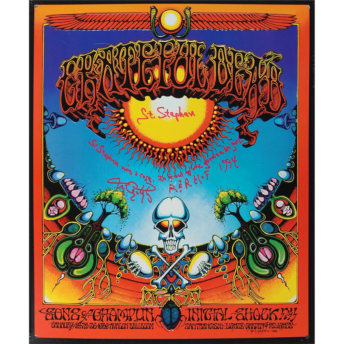Souvenir metal sign of a 1968 Grateful Dead Avalon Ballroom concert poster, signed in red felt tip, “Tom Constanten, R & R HoF 1994,” and adding the opening line of the lyrics to ‘St. Stephen.’ In fine condition.