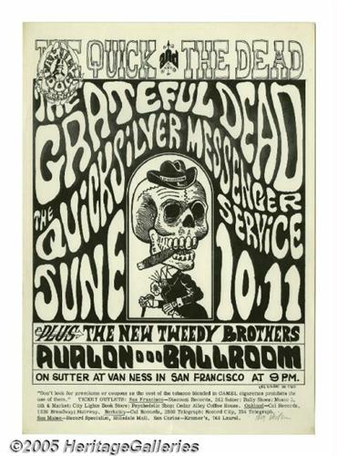 <B>Grateful Dead Wes Wilson Signed "The Quick and the Dead" Poster # FD12, 5/10-11/66 (Family Dog, 1966).</B></I> Don't miss this early Family Dog poster, one of the highlights of our Music Poster collection. It contains a very popular image: a well-dressed skeleton smoking a cigar. It also features two of San Francisco's most popular bands, Quicksilver Messenger Service, and the Grateful Dead. Topping it all off, this poster has a vintage signature in pencil from the artist Wes Wilson on the lower right. In nearly perfect condition, this poster would be the centerpiece in any quality Rock and Roll or Fine Art collection. Its overall size is 14.25" x 19.75". NM-.