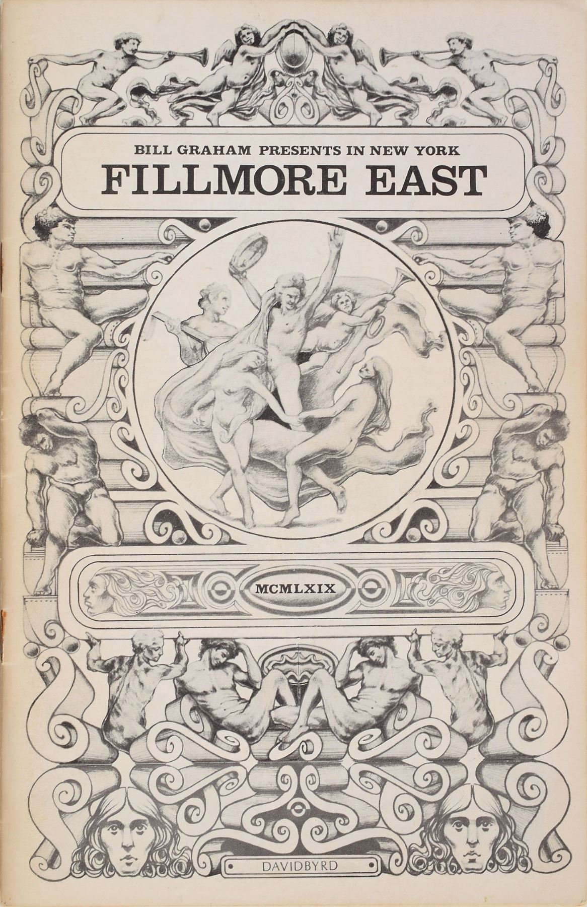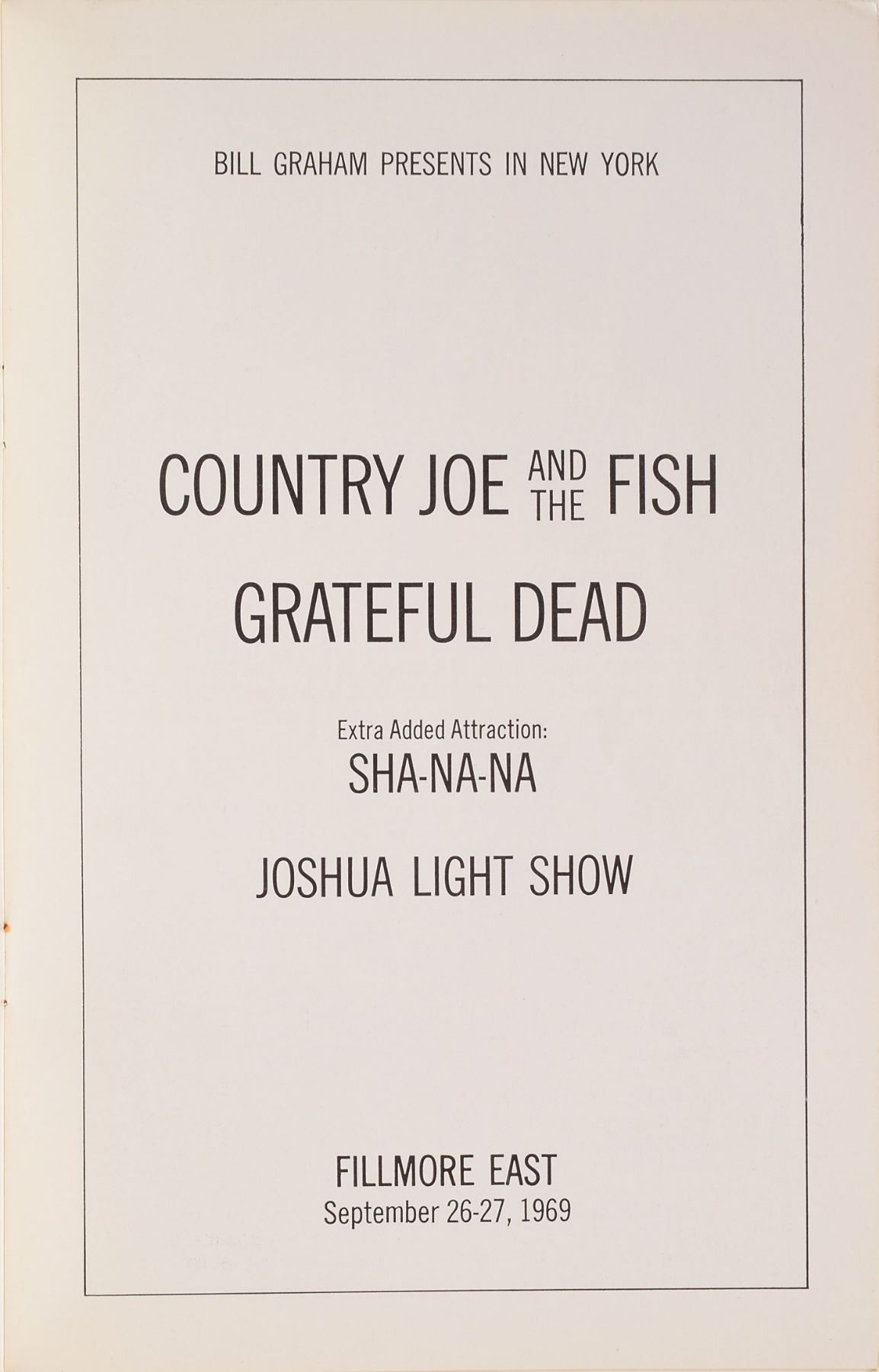 Fillmore East concert program, 5.5 x 8.5, 24 pages, for the Grateful Dead, Country Joe and the Fish, and Sha-Na-Na shows on September 26–27, 1969. This is an unusual billing, with the Grateful Dead as an opening act for Country Joe. The program features images and short biographies of the bands and is like a time capsule of the 1960s, filled with numerous period advertisements. In fine condition.