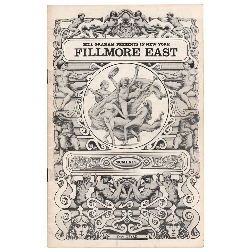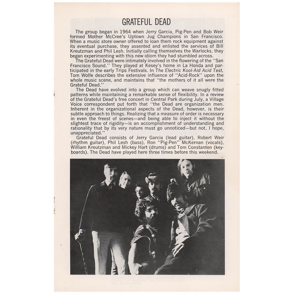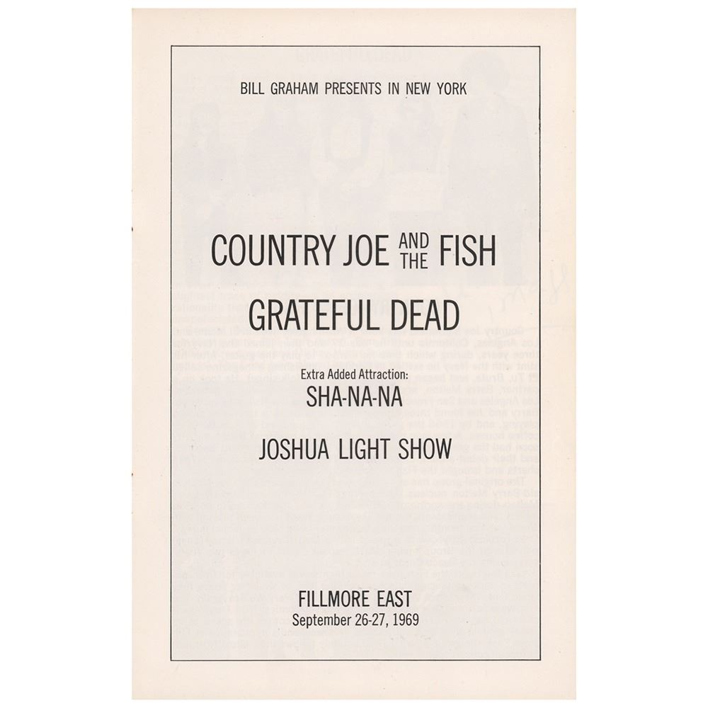 Fillmore East concert program, 5.5 x 8.5, 24 pages, for the Grateful Dead, Country Joe and the Fish, and Sha-Na-Na shows on September 26–27, 1969. This is an unusual billing, with the Grateful Dead as an opening act for Country Joe. The program features images and short biographies of the bands and is like a time capsule of the 1960s, filled with numerous period advertisements. In fine condition.