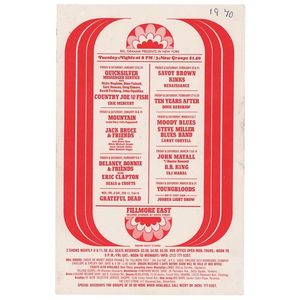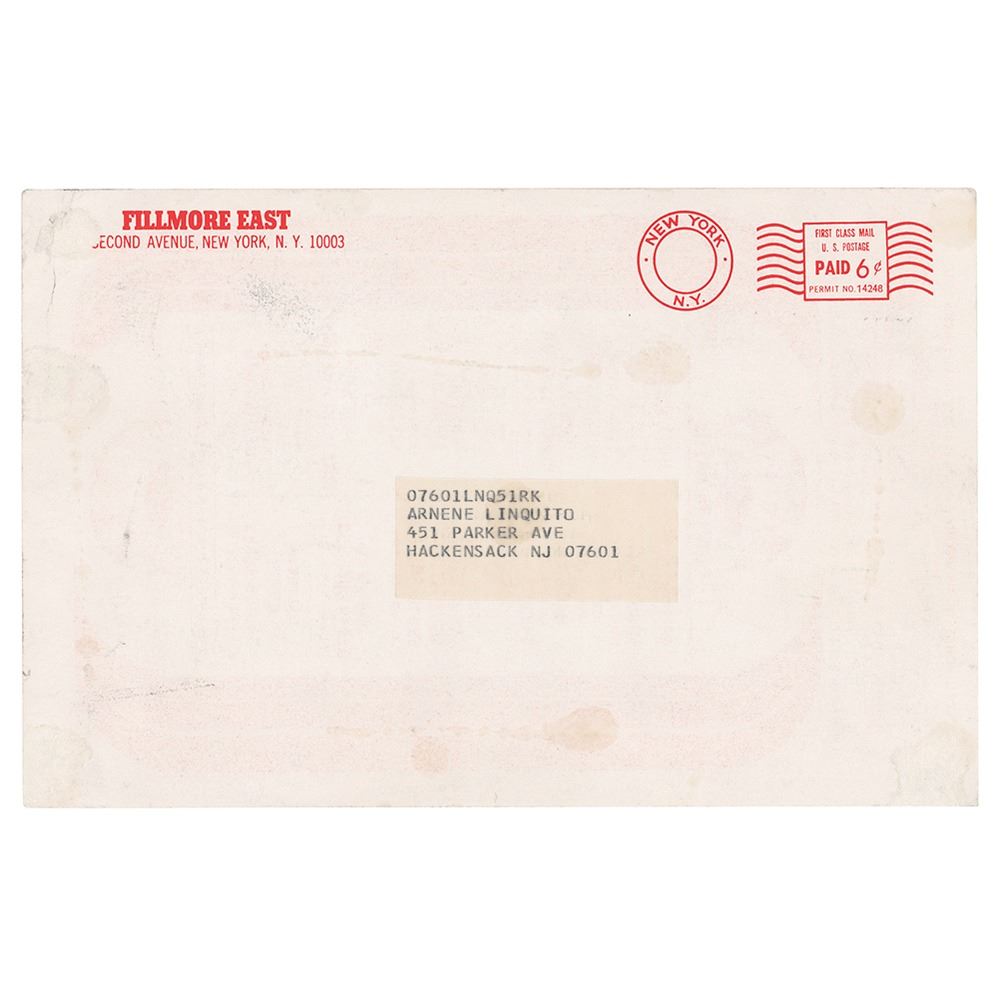 Original 6 x 9 postcard handbill promoting “Bill Graham Presents in New York†concerts held in January through March 1969, featuring bands like the Grateful Dead, Eric Clapton with Delaney, Bonnie & Friends, Jack Bruce & Friends, Mountain, the Moody Blues, The Kinks, Ten Years After, John Mayall, and more. Postal section on reverse bears an affixed address label. In very good to fine condition, with light creasing, and surface loss to reverse.
