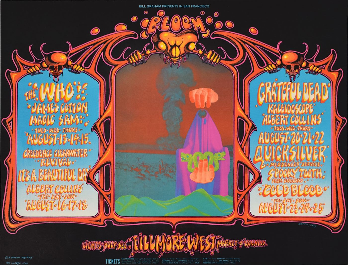 Fantastic original color 28.25 x 22 poster for a concert series presented by Bill Graham at San Francisco's Fillmore West in August 1968, with performances by The Who, Grateful Dead, James Cotton, Creedence Clearwater Revival, Albert Collins, and the Quicksilver Messenger Service. Designed by legendary rock artists Rick Griffin and Alton Kelley (catalog no. BG-133). In near mint condition.