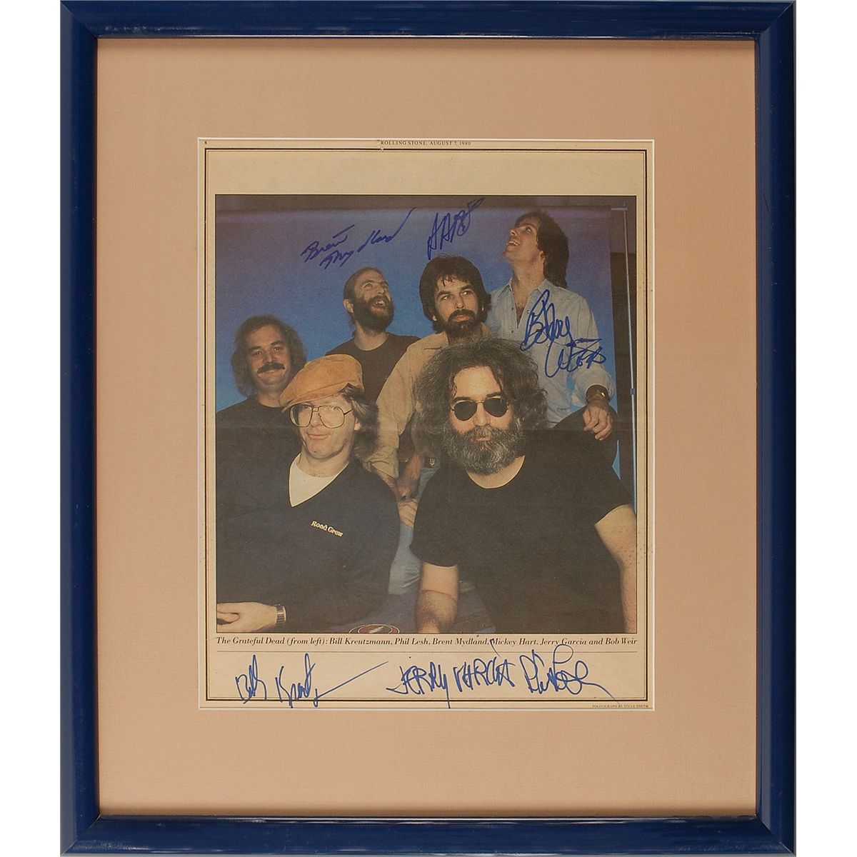 Color 10 x 12.75 Rolling Stone magazine photo of the band from the August 7, 1980, issue, signed in blue felt tip by Jerry Garcia, Brent Mydland, Bill Kreutzmann, Phil Lesh, Bob Weir, and Mickey Hart. Matted and framed to an overall size of 16.5 x 19.25. In fine condition, with a central horizontal fold, a few small creases and dings, and mild overall toning to borders. Group images of this size are not common.