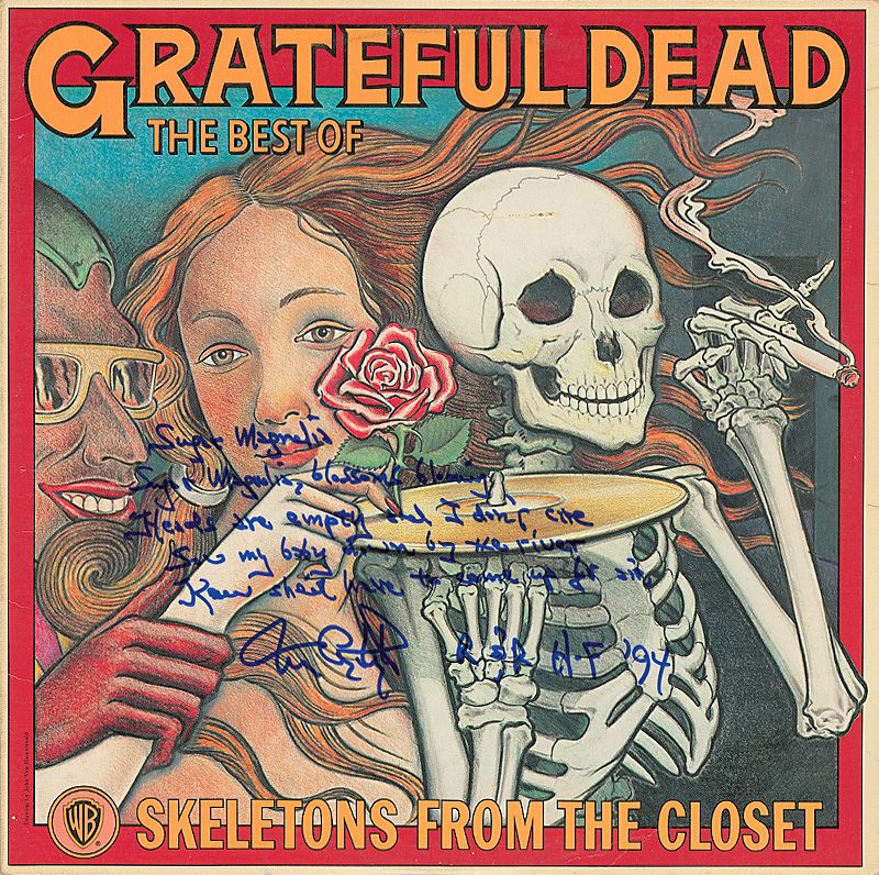 Skeletons from the Closet: The Best of Grateful Dead album signed on the front cover in blue felt tip, “Tom Constanten R&R HOF ‘94,” with handwritten lyrics to Sugar Magnolia: “Sugar Magnolia, blossoms blooming/Heads are empty and I don’t care/Saw my baby down by the river/Knew she’d have to come up for air.” In fine condition, with a few light creases. The record is included.