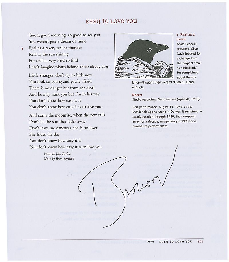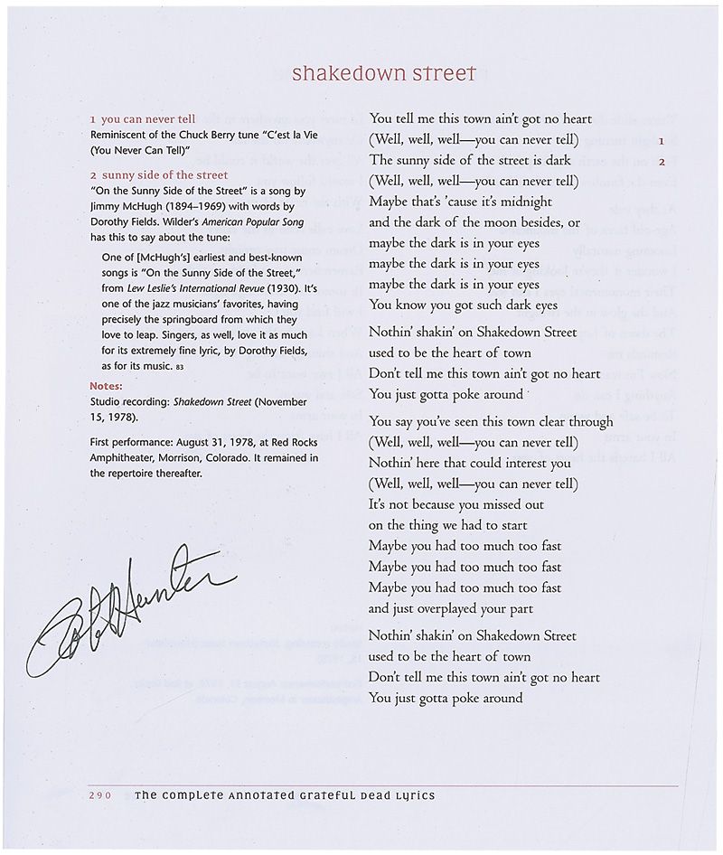 Two pages of lyrics removed from the book The Complete Annotated Grateful Dead Lyrics: ‘Easy to Love You’ signed in black ink by John Perry Barlow and ‘Shakedown Street’ signed in black felt tip by Robert Hunter. In fine condition.