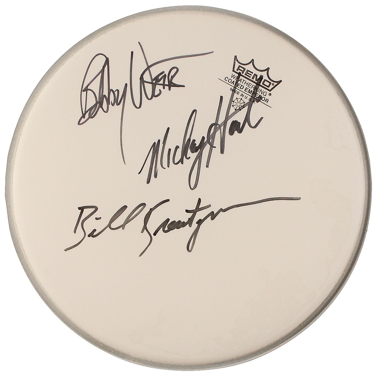 Unused 10? coated Remo drumhead, signed in black felt tip by Bob Weir, Mickey Hart, and Bill Kreutzmann. In fine condition, with some light discoloration along edges.