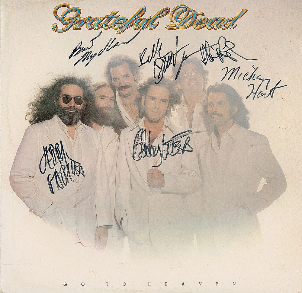 Go To Heaven album signed on the front cover in black felt tip by Jerry Garcia, Phil Lesh, Bob Weir, Mickey Hart, Bill Kreutzmann, and Brent Mydland. In very good condition, with light creasing to edges and corners, mild album impression to front cover, some light damp staining to edges, and light irregular adhesion to signatures. The record is included. Mydland replaced Keith and Donna Godchaux in 1979, and this album featured two of his songs.
