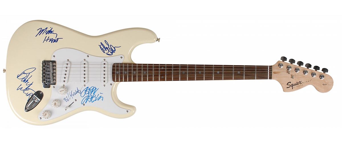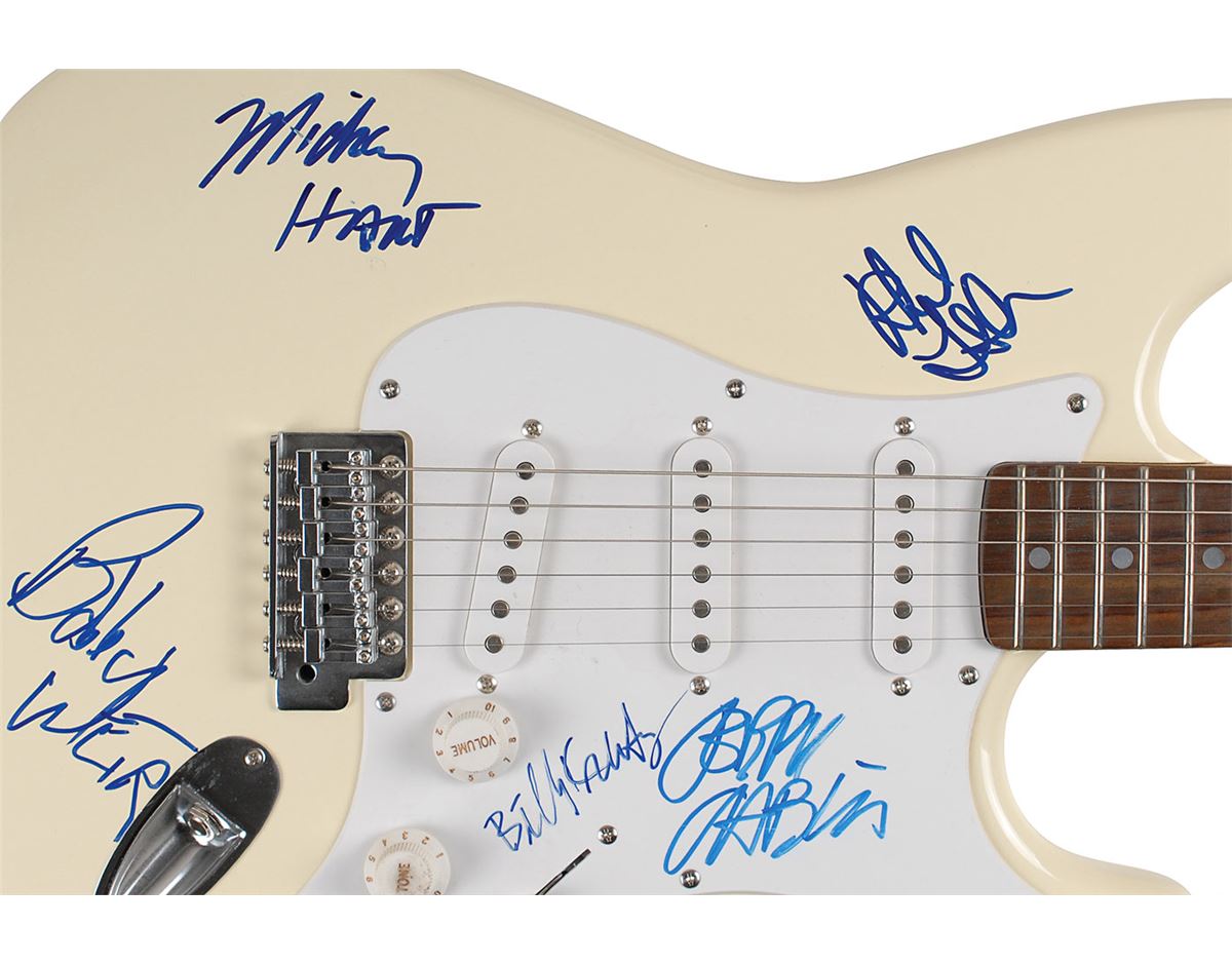 Cream-bodied Fender Squier Stratocaster electric guitar, signed on the pickguard in blue felt tip by Jerry Garcia and Bill Kreutzmann, and on the body by Bob Weir, Phil Lesh, and Mickey Hart. Light scuffing and a few dings to body, trivial irregular ink adhesion to a single letter of the Garcia signature, and a few marks affecting a portion of the Hart signature, otherwise fine condition. Signed by all five original members—the band’s formation now celebrating its 50th anniversary—this is a fantastic piece for any Dead collector. Oversized.