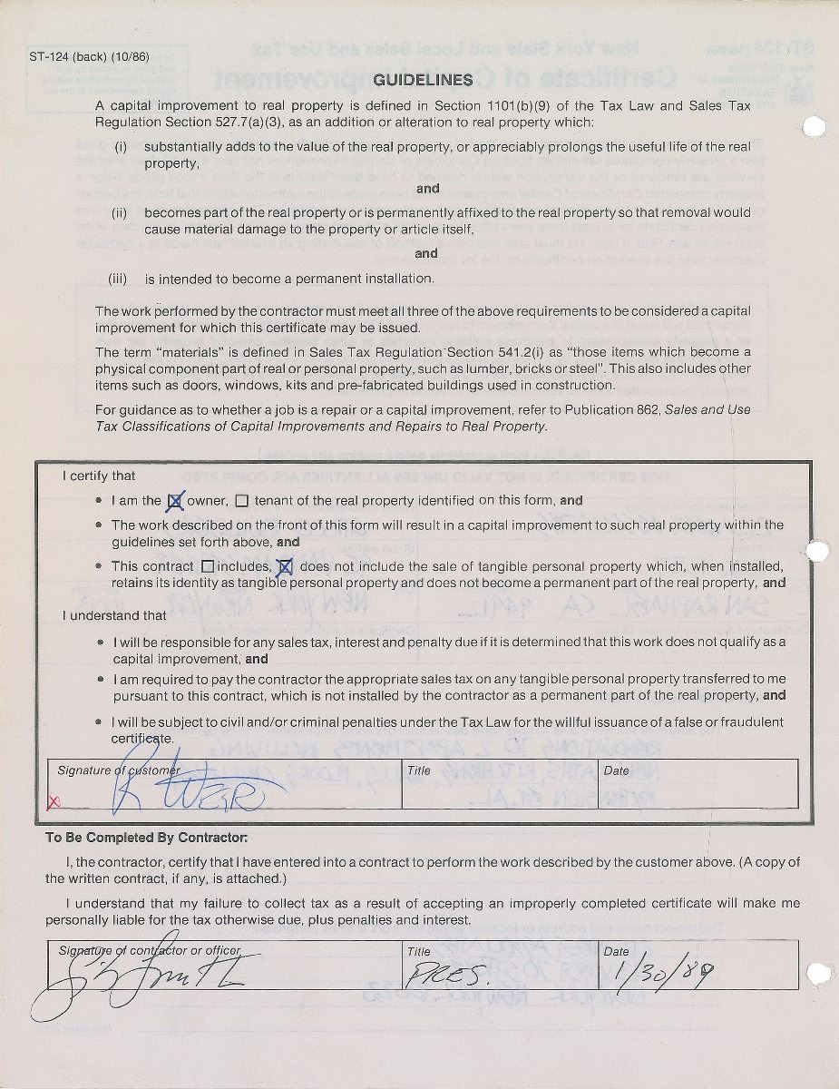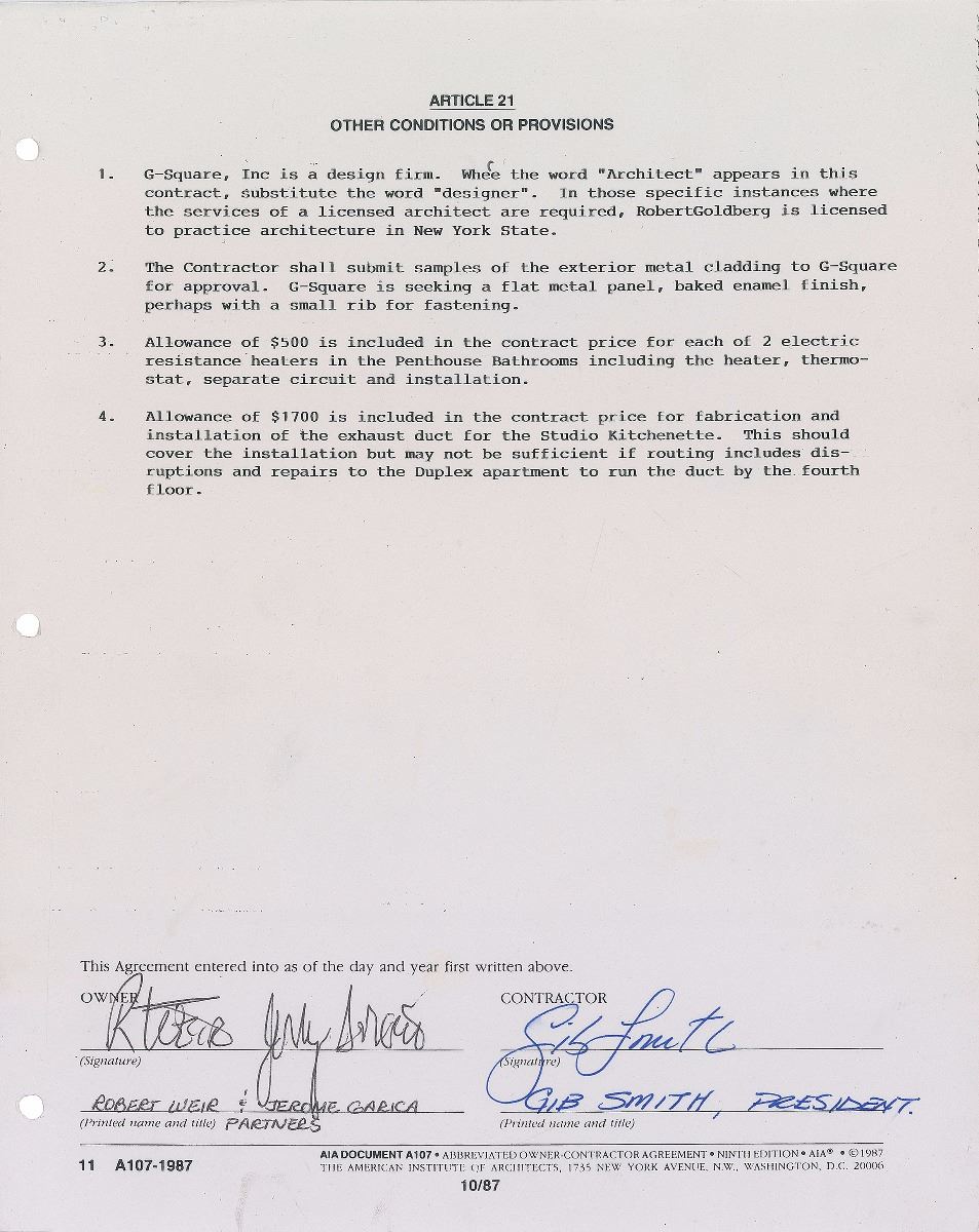DS, signed “Jerry Garcia” and “R. Weir,” eleven pages, 8.5 x 11, October 6, 1988. An agreement outlining details for a penthouse renovation at 213 West 70th Street in New York by which Garcia and Weir hire Gibco Builders, including “demolition…Intercom, Carpet, renovation of Public Corridors except as noted.” Document is housed in a binder with numerous other papers and documents related to the project, including a New York certificate of capital improvement, January 30, 1989, signed again by Bob Weir, “R. Weir.” Two additional documents are signed by Rock Scully, a longtime manager of the band. Expected document wear and tears to binding holes to the first page, otherwise fine condition.