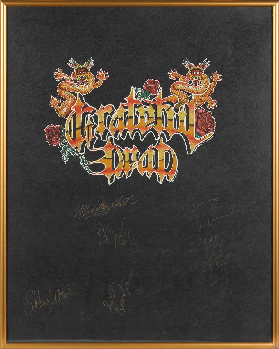 Colorful t-shirt artwork pelon of a Grateful Dead logo with roses and two Chinese dragons against a black background, created by David Forslund and dated 1986, 15.25 x 19.25, signed in gold ink by Jerry Garcia, Mickey Hart, Phil Lesh, Bill Kreutzman, Bob Weir, and Vince Welnick. Framed and in fine condition, with moderate signature contrast against the dark background. These pelons were printed in very low quantities making this a very scarce piece. Accompanied by a full letter of authenticity from REAL.