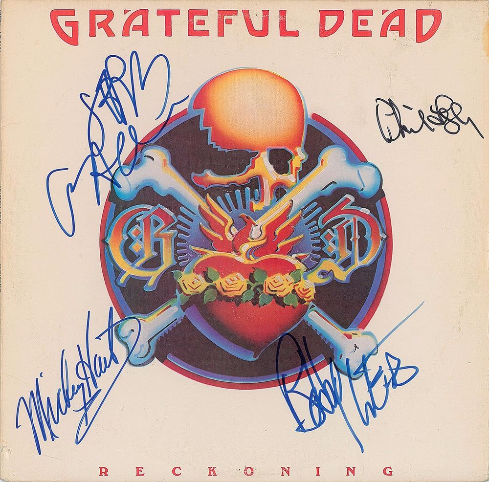 Reckoning album signed on the front cover in blue felt tip by Jerry Garcia, Mickey Hart, and Bob Weir, and in black felt tip by Phil Lesh. In fine condition. The record is not included. Consignor notes that the Garcia signature was obtained at the Ritz-Carlton in Cleveland, Ohio, on September 10, 1993; the Weir and Hart signatures at the Sheraton Suites in Cuyahoga Falls, Ohio; and the Lesh signature on June 23, 2005, at a book store signing in Los Angeles.