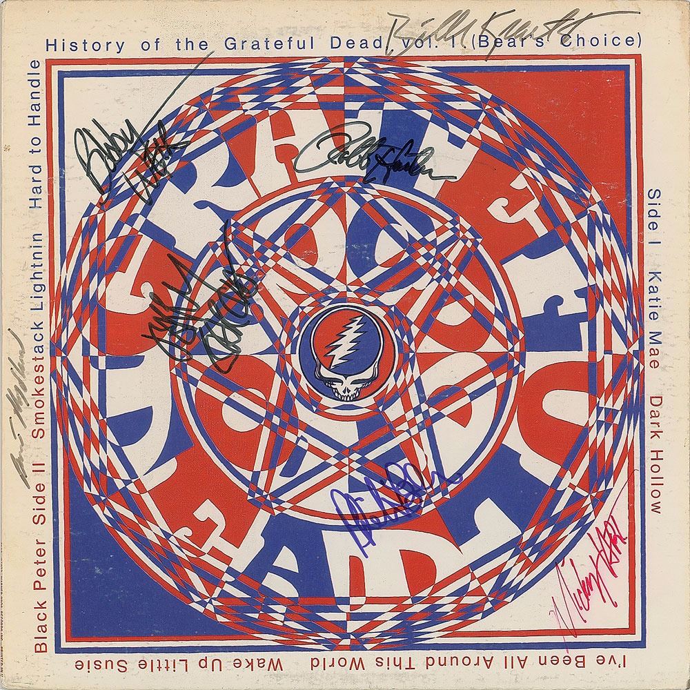 History of the Grateful Dead Vol. 1 (Bear's Choice) album signed on the front cover in black felt tip by Jerry Garcia, Bobby Weir, Bill Kreutzmann, Brent Mydland, and Robert Hunter, in red felt tip by Mickey Hart, and in blue felt tip by Phil Lesh. In fine condition, with expected light scuffing. The record is included.