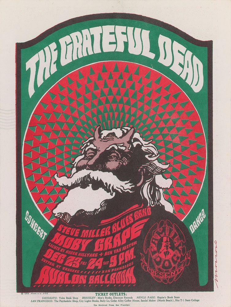 Scarce color 8.5 x 11 handbill for two Grateful Dead concerts at San Francisco's Avalon Ballroom on December 23–24, 1966, showing a horned Santa Claus against a surreal spiral pattern, and listing the Steve Miller Blues Band and Moby Grape as the supporting acts. Right border bears a preprinted signature of the artist, Victor Moscoso. Catalog designation FD-40-OHB-A. In fine condition. Victor Moscoso, one of San Francisco's leading psychedelic poster artists, was a master of color theory and a student of the influential Josef Albers.