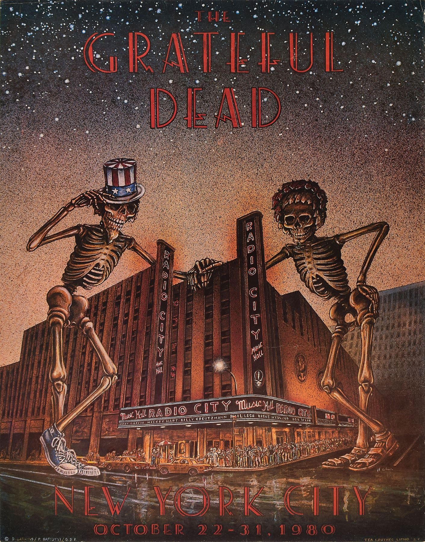 Original color first printing 21.5 x 27.25 poster for a series of Grateful Dead shows held at the Radio City Music Hall in New York City, between October 22–31, 1980, with tremendous artwork of Dennis Larkins and Peter Barsotti depicting two large skeletons casually leaning on the iconic Rockefeller Center venue. In fine condition.
