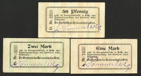Germany, Notgeld. 50 Pfennig; 1, 2 Mark. Bold watermark and light underprint colors on each. Very Fine. 3 pieces.