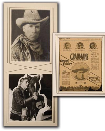 Grauman's Theatre bill showing William S. Hart starring on January 16, 1918. Together with two early photos of "Bill". Theatre bill, 10" x 8". Photos, 8" x 6" and 7 ½” x 6". One original signature. (est $200-300).