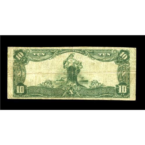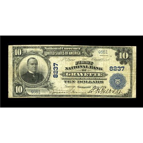 <B>Gravette, AR</B></I> - $10 1902 Plain Back Fr. 625 <B>The First NB</B></I> Ch. # 8237<BR>An attractive large example from this better Arkansas bank. Pen signed <B>Fine+++.</B></I>