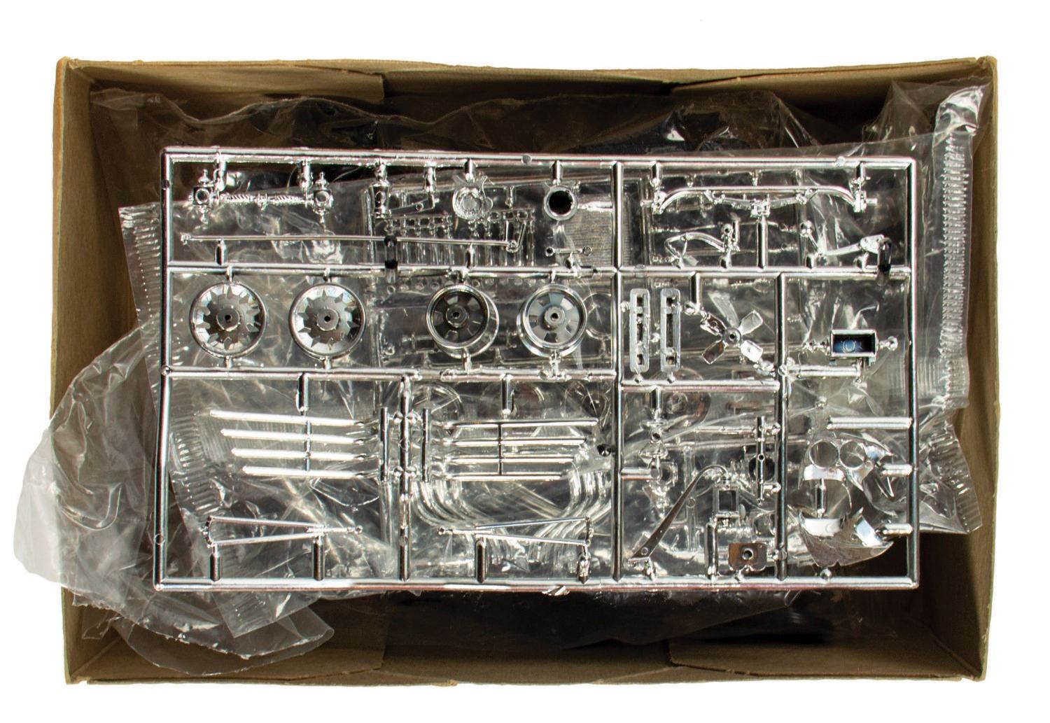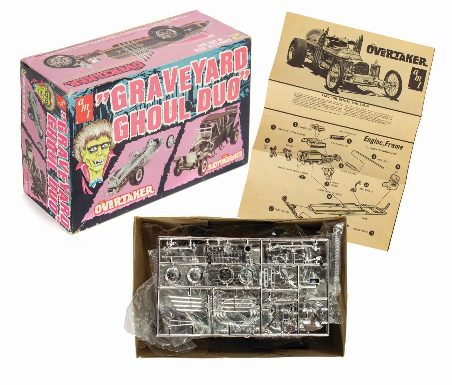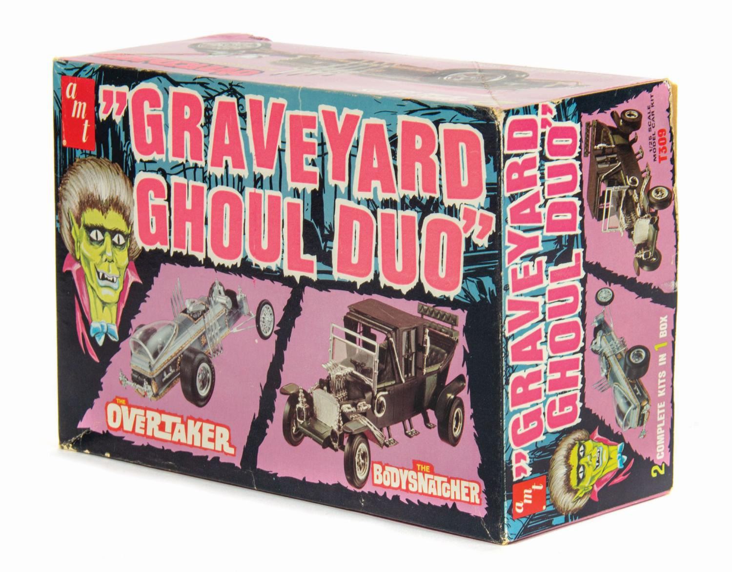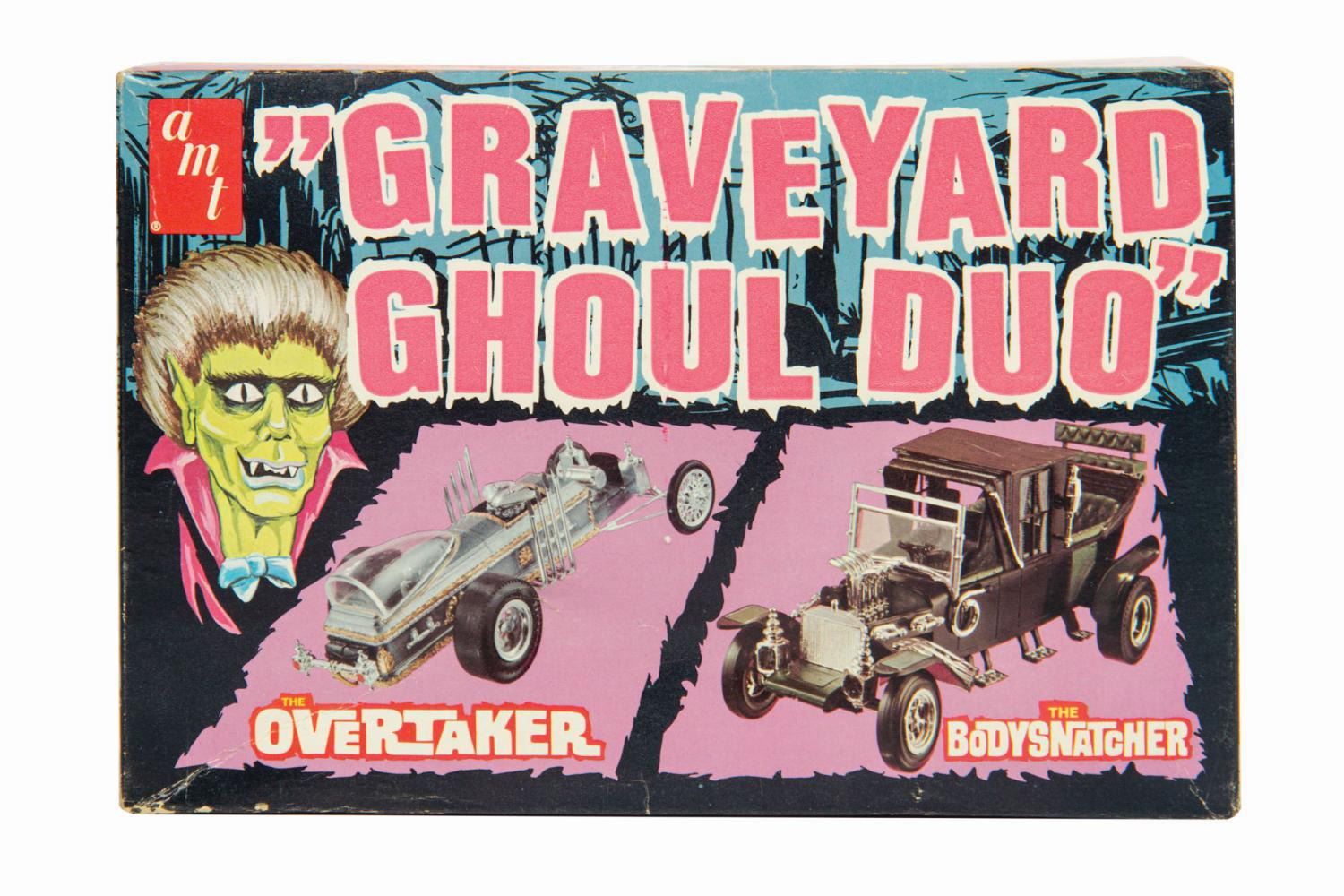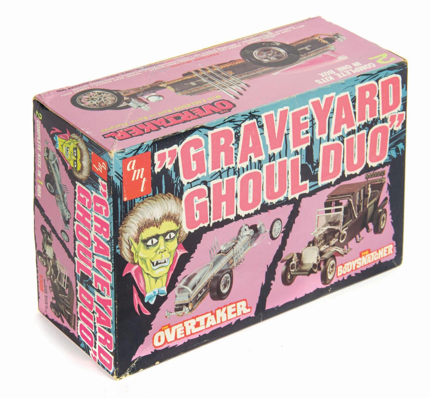(AMT, ca. 1960s) A vintage 1:25 scale Graveyard Ghoul Duo model kit containing two macabre kustoms, The Overtaker and the BodySnatcher. Based on Chuck Barris's designs for Herman Munster's Drag-U-La and the Munster Koach, respectively, these models were rebranded versions of the earlier licensed kits. The vast majority of the pieces are still attached to the plastic runners. The decal sheet is intact and the instruction manual is included. Measuring 6"x9.25" and 4" deep, the original box is in very good condition with minor denting, a few creases, stress lines, scuffs, and edge wear. The models are as new.