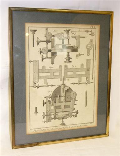 Gravure d'une machine d'horlogerie 18ème dans cadre en laiton doré