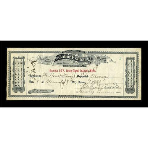 <B>Gray Cloud Island, MN- Labor Exchange </B></I>$2.50 Deposit Receipt 1897<BR> This is the first Labor Exchange piece we have had from Minnesota. For a detailed listing of branches in the United States and Canada, see <I>Paper Money, </B></I>the Society of Paper Money Collectors, Inc. November/December 2007. <B>Very Fine</B></I> with a couple of pinholes.<BR><BR><b>Shipping:</b> Coins & Currency (<a target="_blank" href="http://www.heritageauctions.com/common/shipping.php">view shipping information</a>)