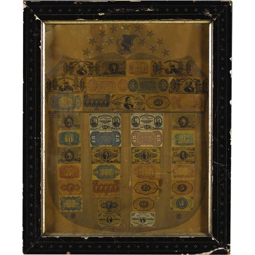 <B>Gray Fractional Currency Shield.</B></I> Housed in a contemporary plaster and wood frame with a broad-planked back. The frame has a number of chips, but is still far nicer than the wretched shield offered in our last sale. The shield itself is extremely aged with stains, tears, folds, and a little insect damage. A few notes are missing small pieces. The high point are the two Grant-Sherman pairs which have not aged as badly as the rest of the shield. We always try and find something nice to say about every lot. In this case, the best we can do is...a genuine shield.<BR><BR><b>Shipping:</b> Coins & Currency (<a target="_blank" href="http://www.heritageauctions.com/common/shipping.php">view shipping information</a>)