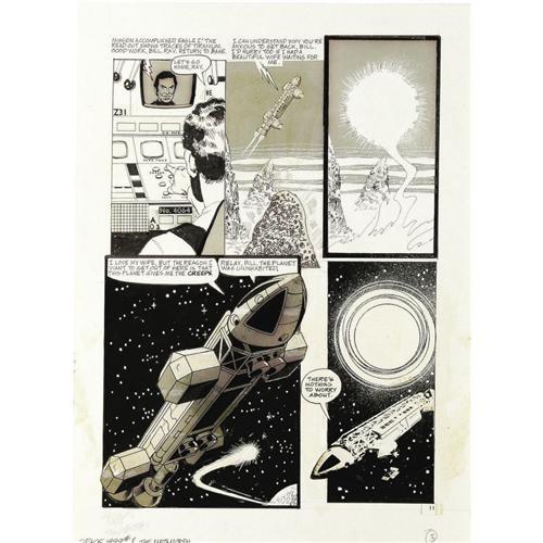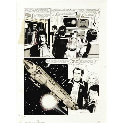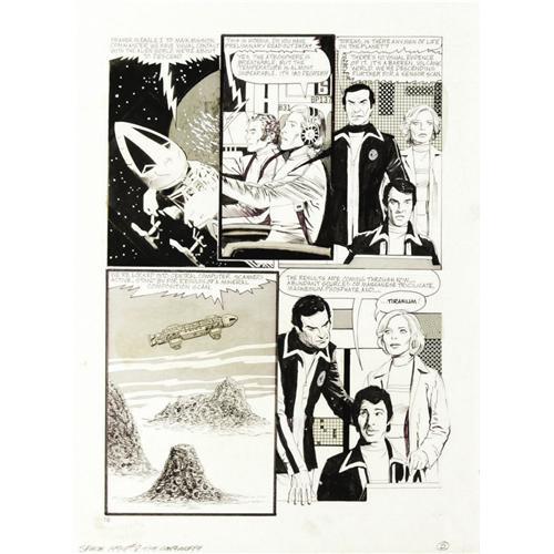 <B>Gray Morrow - Space: 1999 Magazine #8 Final Issue Complete 30-page Story Original Art (Charlton, 1976).</B></I> Gerry Anderson's cult TV classic, "Space: 1999," ran from 1975 to 1977, and the show was also adapted as a black and white illustrated magazine in 1975-76. This thirty-page thriller, published in the October 1976 final issue, was drawn by sf/fantasy master Gray Morrow. "The Metamorph" features the first appearance of Miya (Catherine Schell), plus Commander Koenig, Prof. Victor Bergman, and Dr. Helena Russell. Gray Morrow illustrated this spectacle in greytone mixed media, using ink, pencil, and collage. Each page of the yarn has an approximate image area of 10.5" x 15". There is some marker fading, white-out usage, and some paper aging; otherwise, these pages average Very Good condition. <BR><BR><B>Important notice:</B> Heritage usually auctions material at the rate of 200-250 lots per hour. On some occasions eBay Live bid software or the Internet may not be able to keep up with the pace of the auction. We recommend placing a realistic absentee bid now as insurance to avoid disappointment. Occasionally the auctioneer may eliminate or reject an eBay Live bid, and the auctioneer may also reopen a lot after the close of the eBay live bidding (usually because we missed an audience bid), and may reject your bid even if it shows you as the winning bidder. By bidding via eBay Live, you agree that Heritage may award the lot to another bidder at its sole discretion under the circumstances described above or any other reasonable circumstances. Since eBay bids are not shown to us until we open the lot on the floor, we treat those bids just like floor bids. In most cases the floor responds before the eBay bid is presented to us, due to Internet lag time, so for consistency we have made it a policy that floor bids are always considered first over tie eBay live bids. Also please note that all Heritage lots purchased through eBay Live carry a 22.5% Buyer's Premium. Please make sure you read the Terms and Conditions before you bid. This lot is being auctioned in conjunction with a live floor auction by Heritage Auction Galleries. All final auction and invoice information will be supplied by Heritage Auction Galleries, and all other information should be considered preliminary. Lot:41001 <BR><BR><B>Winning Notification and Billing:</B> After the FINAL session in this auction is complete, Heritage will send e-mail and snail mail invoices. This process normally takes several days. All final auction and invoice information will be supplied by Heritage Auction Galleries, and all other information should be considered preliminary. <BR><BR>This auction will be conducted on a live auction floor and over the Internet through eBay Live. If you choose to place an absentee bid, please take a moment to <font color='#0000ff'><u><a href='http://pages.ebay.com/liveauctions/help/before/laabsentee.html'>learn how eBay Live absentee bidding works</a></u></font><font color='#000000'>
