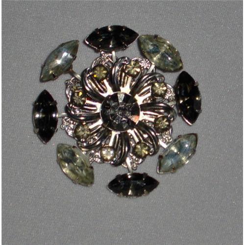 This 1940s to 1950s pin features alternating gray and white marquis-shaped rhinestones encircling a central round rhinestone and smaller rhinestones.</em></td>