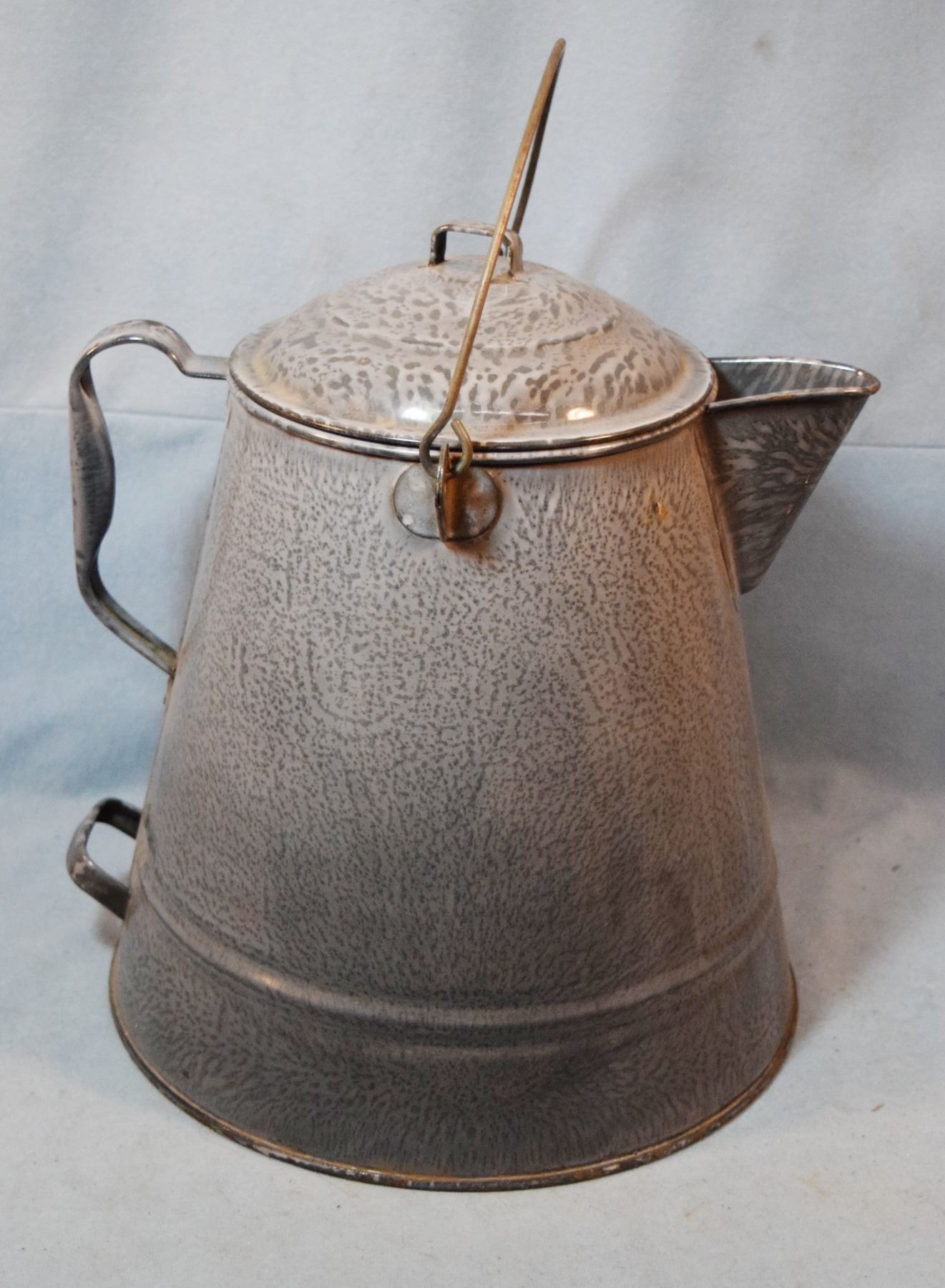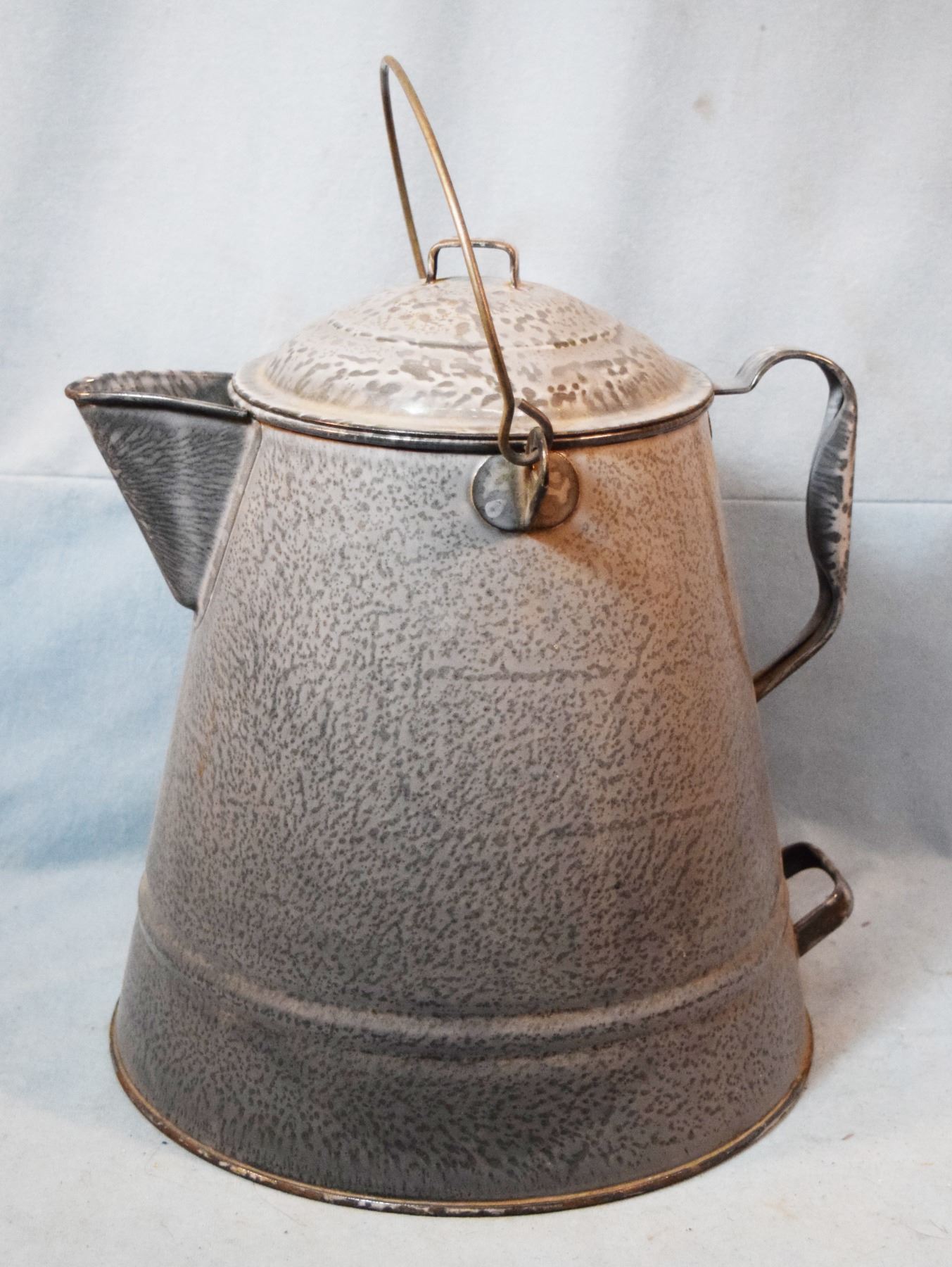 Gray enameled coffee pot, 14" tall, 10" diameter base