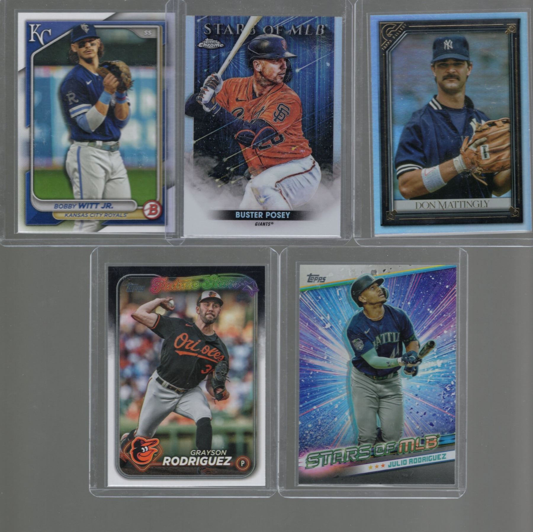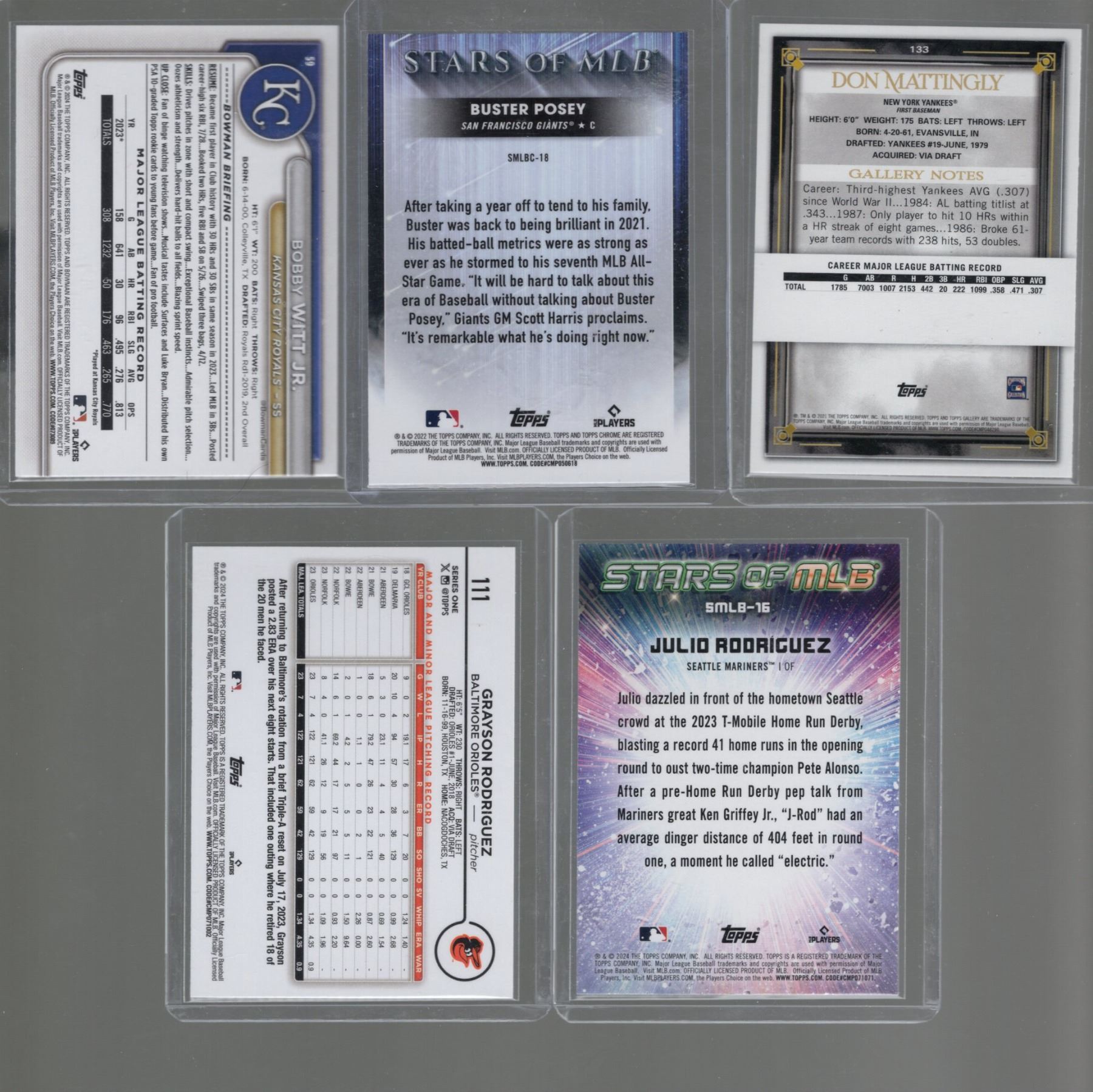 Grayson Rodriguez Future Stars '24 Topps, Julio Rodriguez SMLB, Bobby Witt, Jr., Buster Posey CSMLB, Don Mattingly '21 Topps Gallery.