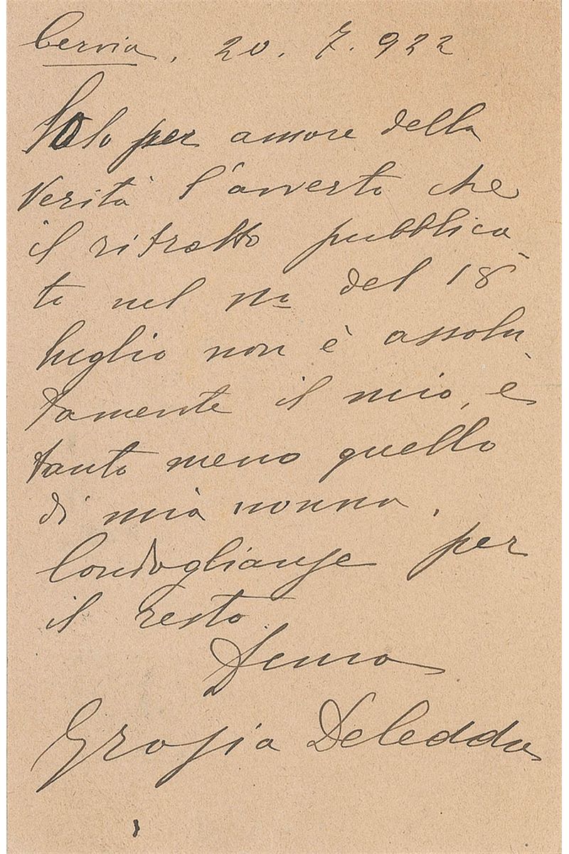 Italian writer (1871–1936) whose works vividly portrayed the life in Sardinia and in 1926 received the Nobel Prize for Literature. ALS in Italian, one page on a plain 3.5 x 5.5 postcard, Cervia, July 20, 1922. Translated in full: “Only for the love of truth, I warn you that the portrait published on your issue of July 18th is not my likeness nor my grandmother’s. My condolences for the rest.” Addressed in her own hand on the reverse to the direction of the newspaper Epoca. In fine condition, with a uniform shade of toning.