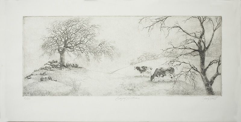 Sandy Scott, b. 1943 NWR, SAA | Signed: 14/100, l/l; Grazing Holsteins, l/c; Sandy Scott, l/r, l/r | Media: Etching on paper | Dimensions: 6 by 15 inches