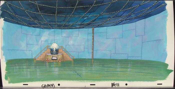 This original hand-painted background is from the Nickelodeon TV show SpongeBob Squarepants. The story takes place under the deep blue sea in Bikini Bottom, where SpongeBob resides. SpongeBob, who is a yellow, porous sponge, is your typical happy-go-lucky character, as he is always cheerful and enjoys making people laugh. Patrick Star, SpongeBob's neighbor who is a starfish, is your average children's show idiot, as he boasts knowing nothing and is often getting himself into ridiculous situations. Between the homes of these two lies the home of the miserable Squidward, a squid, who is known for being grouchy and playing tricks on SpongeBob and Patrick. Both SpongeBob and Squidward work at the Krusty Krab, a fast food business run by the greedy money-loving Mr. Krabs, a crab, the arch rival of the evil, possibly misunderstood, Plankton. Another neighbor, Sandy Cheeks, an athletic squirrel who normally wears an astronaut's space suit, was introduced in "Tea at the Treedome." She spends most of her time inventing and experimenting. Here, it looks like there is a grease bucket on display.Original Production Background Overall Size of Background: 10 1/2" x 20 1/2" Very good condition; it has been stored rolledOriginal Production Backgrounds are used in the making of the final version of animated productions. The background establishes the location and the overall good mood of the scenee. Typically, a background layout artist creates a drawing to establish the content of the scene, placement of characters, perspective and camera angle. Based on this drawing, the background artist creates a preliminary painting to confirm all of the scenes details, then the final production background which is used in the filming of the scene. When these backgrounds are individually photographed behind the progression of production cels, and projected at a rapid succession, the images in the foreground appear to move, creating an animated scene. The background is ready to be matted and framed. It is a colored background with the animator's notations at the bottom.