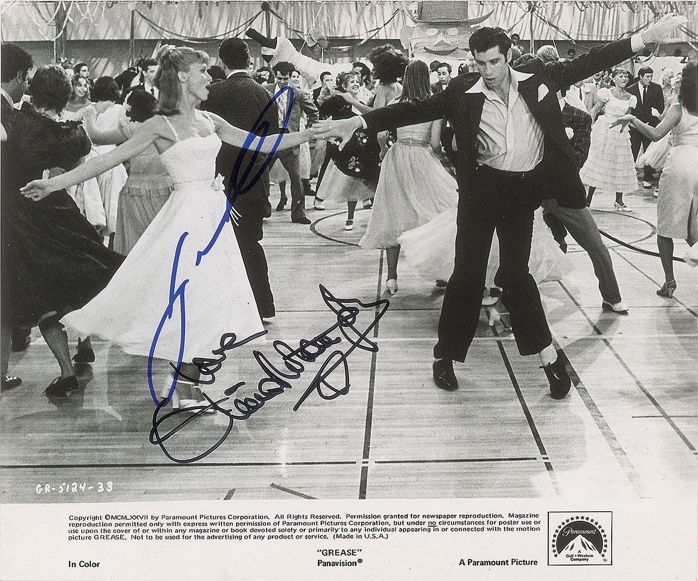 Glossy 9.75 x 8 mini lobby card for the 1978 film Grease, signed in blue felt tip, "John Travolta," and in black felt tip, "Love, Olivia Newton-John." In fine condition, with slightly trimmed edges. Originally obtained by in-person specialist Mike Wehrmann.