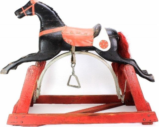 body on metal frame work attached to original wood base. Features glass eyes and dyed horse hair tail. Early Americana piece, 36" long. Est. 400-800