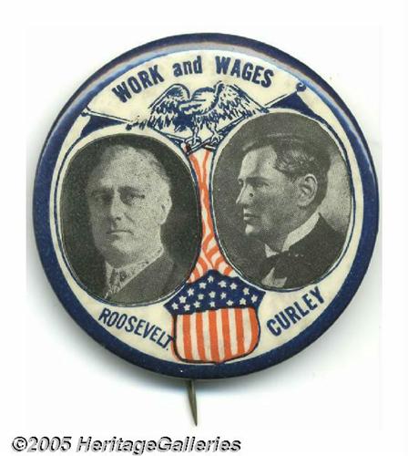 <B>Great 2 1/8" Franklin D. Roosevelt and Boston Mayor James Curley "Coat-tail" Jugate Button</B></I> The scarcer "Work and Wages" variety, in fine condition. Lot:263