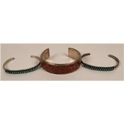 One is coral set in silver, silver cuff. Two narrow cuffs set with petit point turquoise. All in excellent condition.