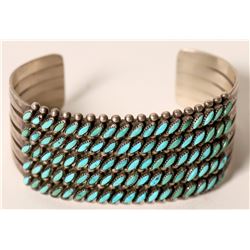 Stamped and beaded silver cuff with beautiful 5 rows of turquoise petit point. 5" inside measurement, 1.25" opening.