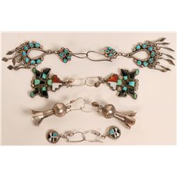 1) Zuni Sun, 2.5" diameter, tie ends, .25" diameter. Beautiful piece--onyx, mother of pearl, turquoise, coral all set in sterling. 2) Hors...