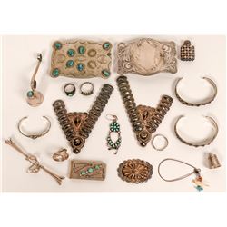 Nickel silver: 2 bracelets, collar point covers, pendant; Silver: candle snuffer, tiny bottle, thimble, earrings, child's bracelet, money clip, ...