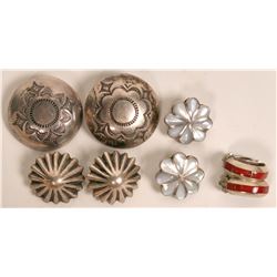 Four pair, Navajo and Zuni: stamped silver, 1.25" diameter; fluted silver rounds; coral inlay half rounds; mother of pearl set in silver, flora...