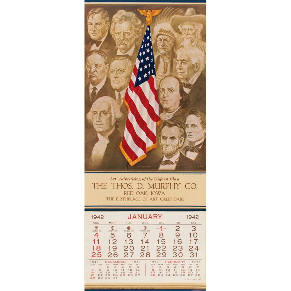Colorful World War II-dated 7.75 x 18.5 salesman's sample of a calendar for January 1942 entitled 'Great Americans,’ with main artwork of an American flag surrounded by images of famous Americans like George Washington, Abraham Lincoln, Benjamin Franklin, Thomas Edison, Mark Twain, and more. Printed by the Thos. D. Murphy Co., Red Oak, Iowa. In fine condition.