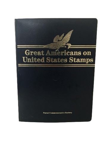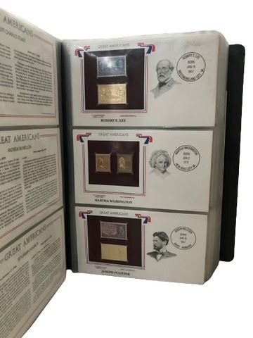 Great Americans on United States stamps book from the Postal commemorative society. Mint condition historic stamps match with their exact replicas in gleaming 22 karat gold. This proud collection pays tribute to 100 great Americans who is mark on history will never be a raced. It is a unique combination of historic, mint condition US stamps and exact 22 karat gold replicas that will securely become a treasured family heirloom.